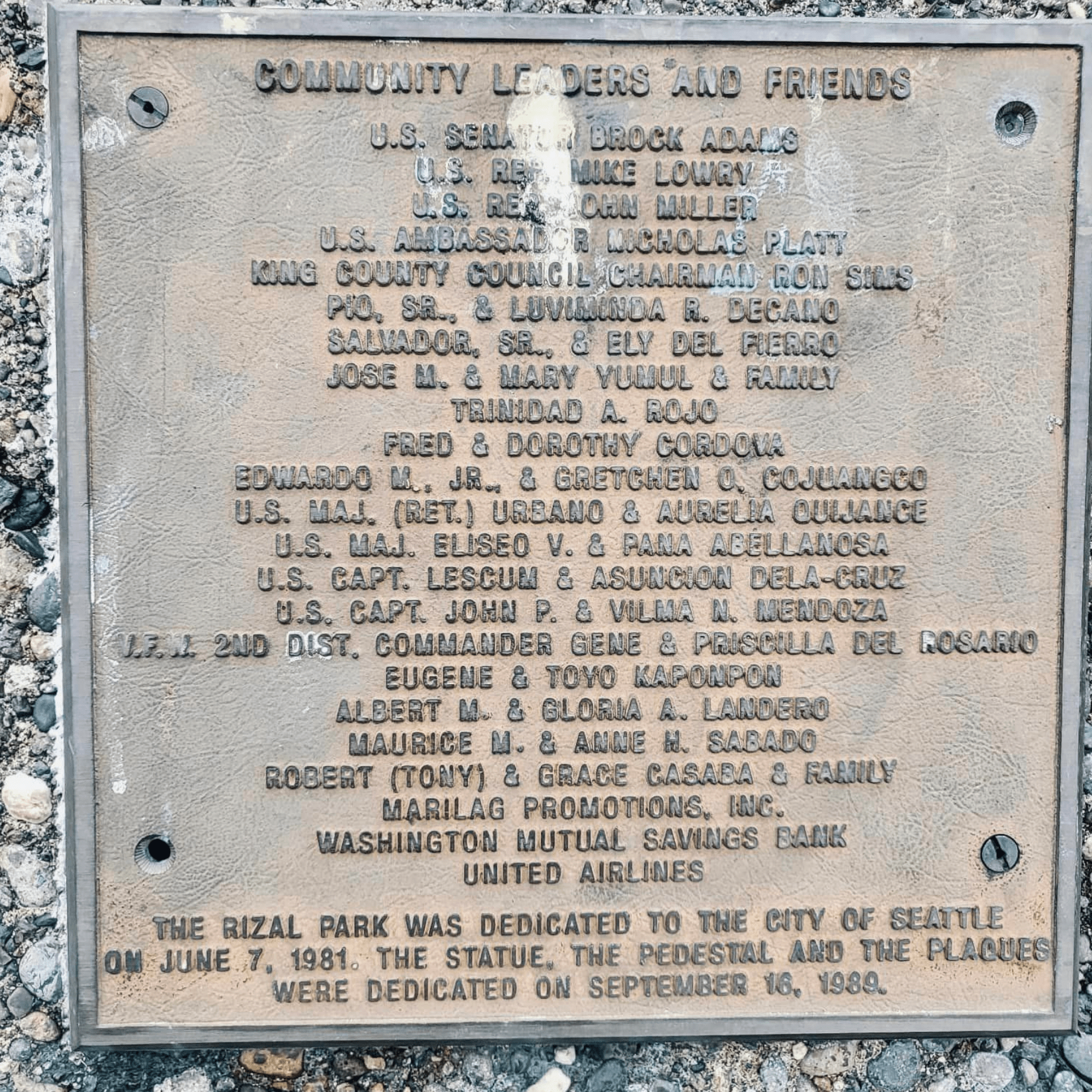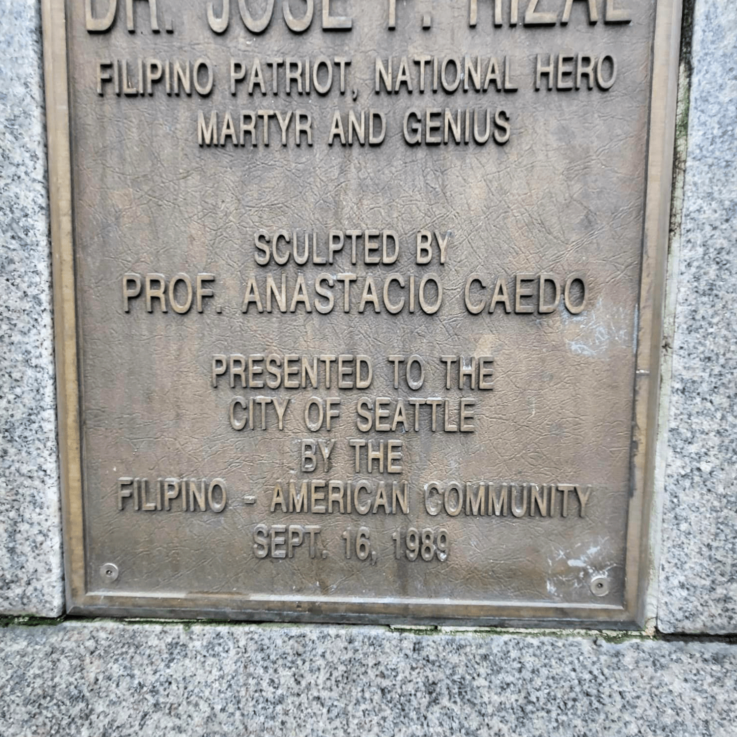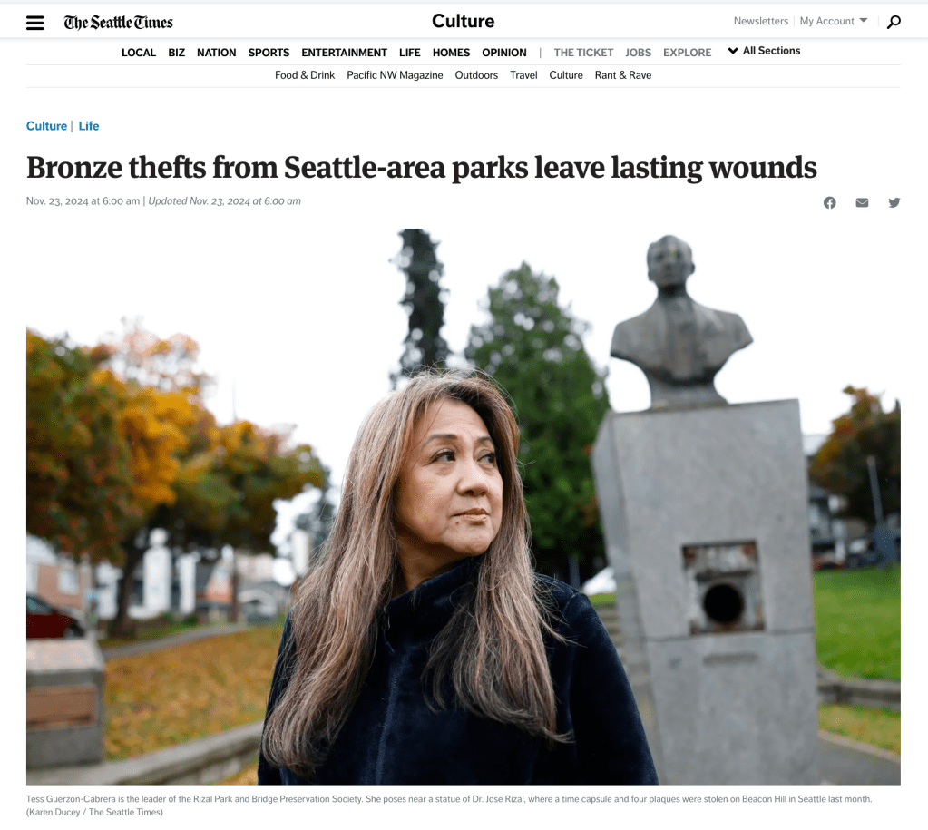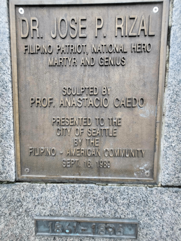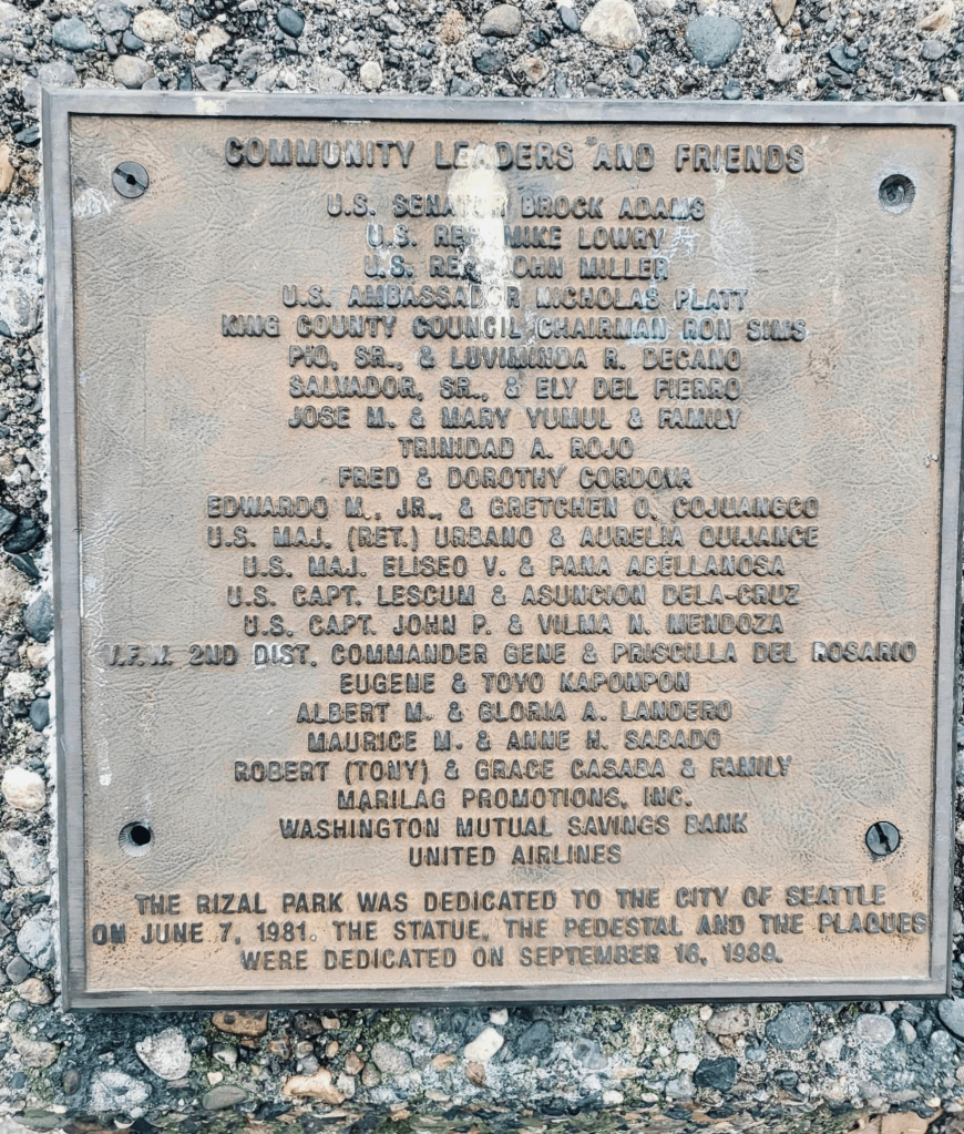 “In 1989, the Rizal Park & Bridge Preservation Society installed the park’s central feature, a prominent bronze bust of Dr. Rizal designed by Filipino sculptor Anastacio Caedo. Funding for the bust was secured thanks to the efforts of, among others, Zenaida F. Guerzon, an active figure in the community and a longtime ally of the project, and Seattle councilwoman Dolores Sibonga. It was also funded in part by a creative time capsule campaign, mirroring a similar capsule described in Rizal’s novel Noli Mi Tangere, installed underneath the statue – a fitting metaphor for the endurance into the future of a Filipino American community in Seattle.”