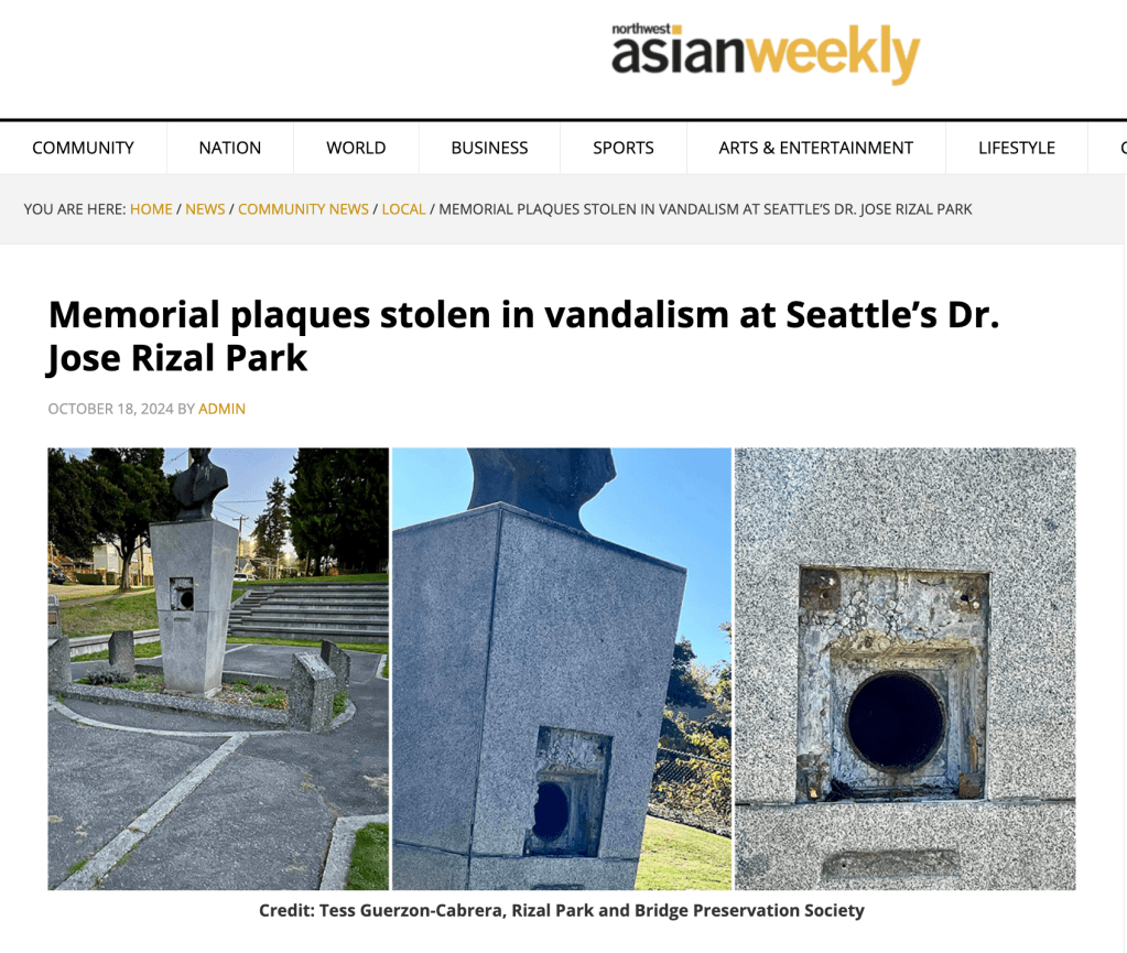 Memorial plaques stolen in vandalism at Seattle’s Dr. Jose Rizal Park
